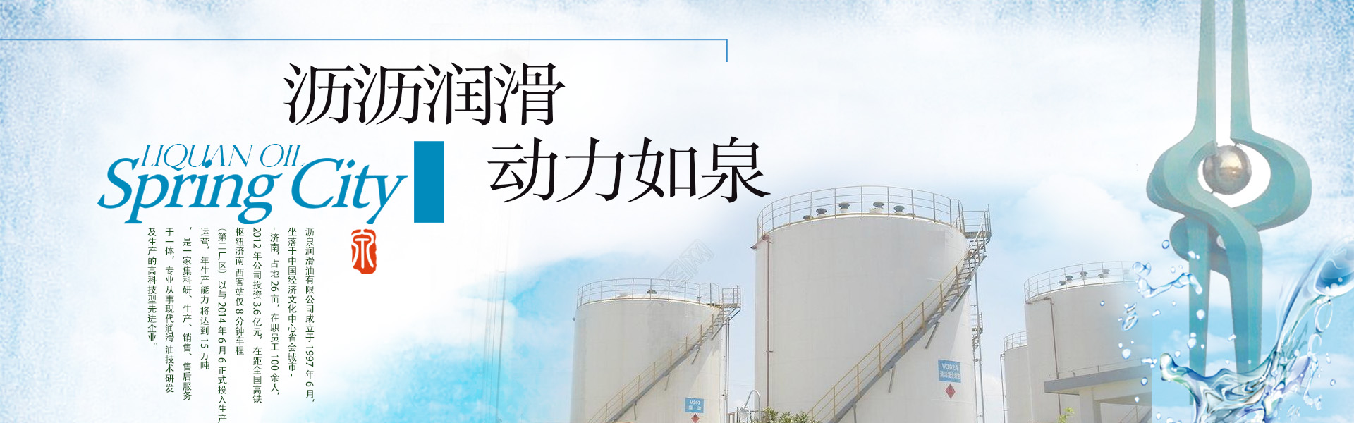 瀝泉潤滑油有限公司成立于1997年6月,坐落于中國經濟文化中心省會城市--濟南, 占地26畝,在職員工100余人,2012年公司投資3.6億元,在距全國高鐵樞紐濟南 西客站僅8分鐘車程(第二廠區)以與2014年6月6正式投入生產運營,年生產能力 將達到15萬噸,是一家集生產、銷售、售后服務于一體,專業從事潤滑油生產的企業。 產品共有15大類,150多個品種,廣泛應用于汽車、工程機械、船舶、冶金、發電 機組、工業設備、軍工等領域。 公司產品已形成多系列、多品種、多規格的格局。并在30多個省市自治區建立400 多家代理商。經銷商8000多家,深受用戶好評! 在潤滑油行業領域展現著她傲人的身姿。公司秉承“以人品打造精品,以精品奉獻 客戶”的企業理念,引進國內外先進企業管理經驗和管理方法 公司簡介